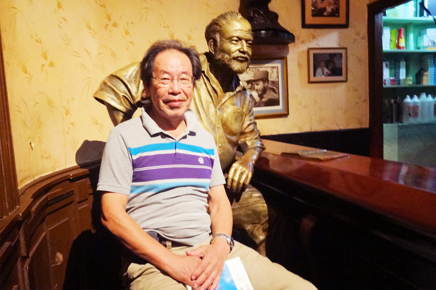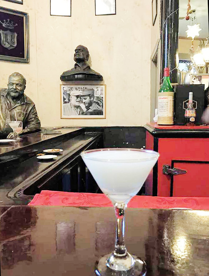 Xさんがふらりとある店のドアを開けて入った。狭い店内のバーカウンターの左隅にはヘミングウェイの金色に輝く肖像。オオッ、ここが有名な「フロリディータ」なのだ。ホテル・アンボス・ムンドスで執筆を始めて以来、ヘミングウェイはこのバーに朝夕始終出入り。ノーベル賞を受賞した後は、バー自体世界的に有名に。元はと言えば、1820年に作られた老舗の居酒屋。地元のさまざまな人々で賑わうこの店で寛ぐのが楽しみだったが、1914年、スペイン生まれのコンスタンティノ・リバイラグアというバーテンダーが、ラムとレモンジュース、砂糖をミックスしたカクテル「ダイキリ」を作り出して、ヘミングウェイはその虜になった。