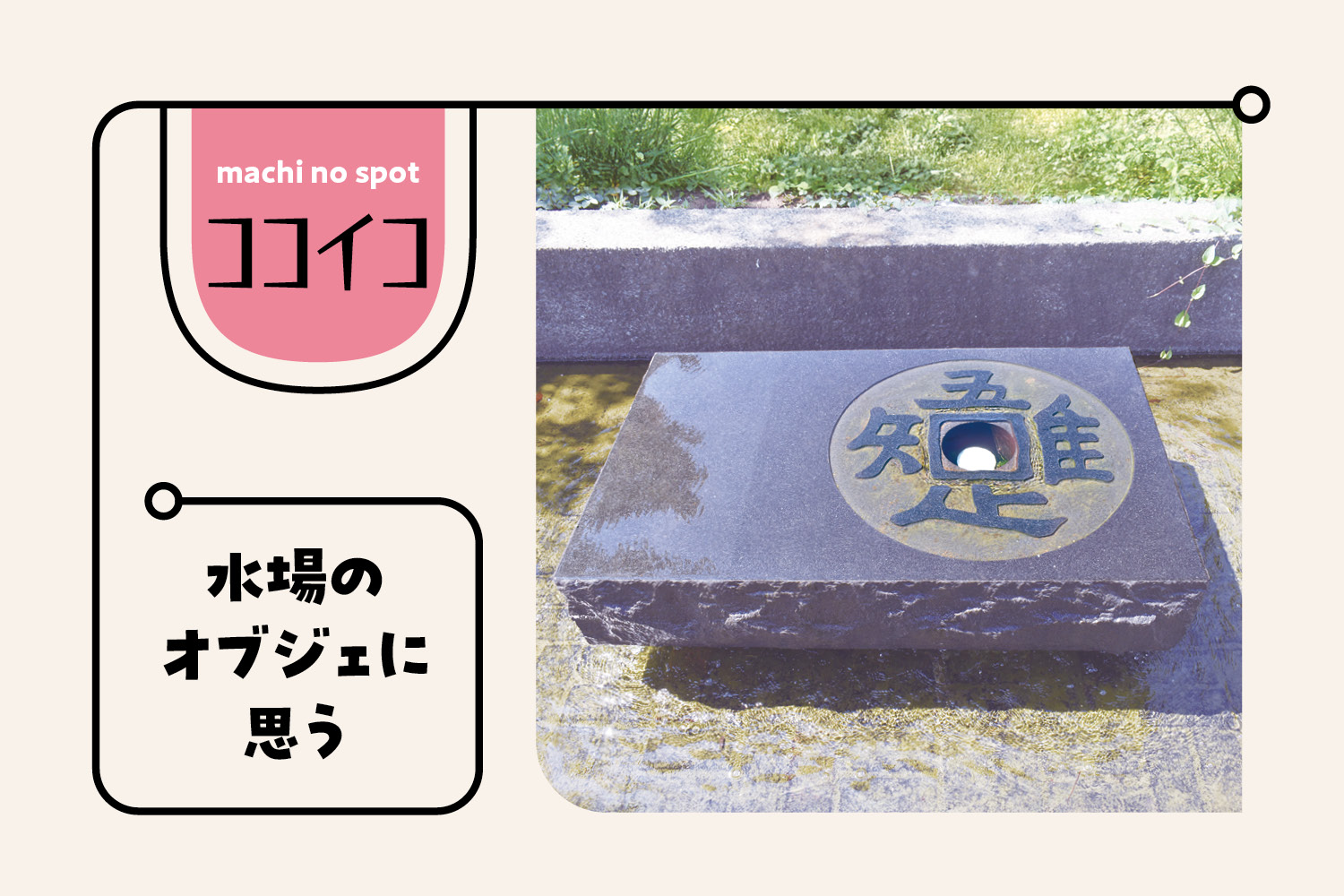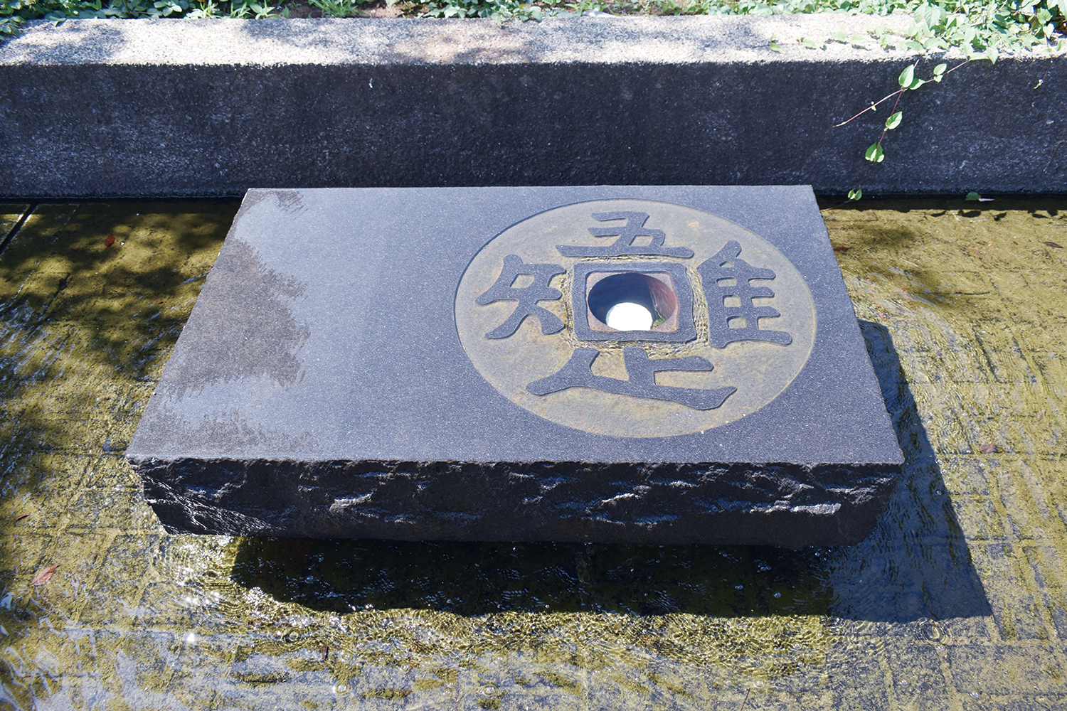 右手の水場の石のオブジェに目を向けて! 和同開珎のような模様には「吾唯知足(われただたるをしる)」の文字。