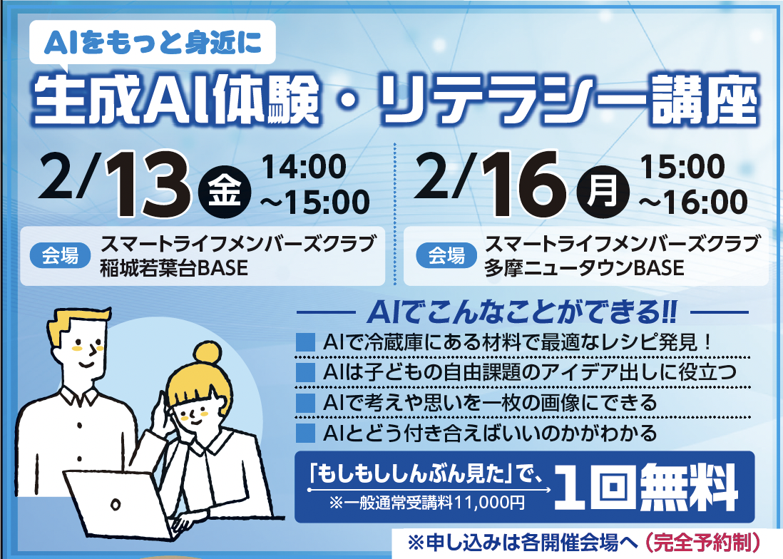 『もしもし』見たで、(『スマートライフメンバーズクラブプレミアム会員』未加入の方も)「生成AI体験・リテラシー講座」1回無料で受講いただけます。(一般通常受講料11,000円)