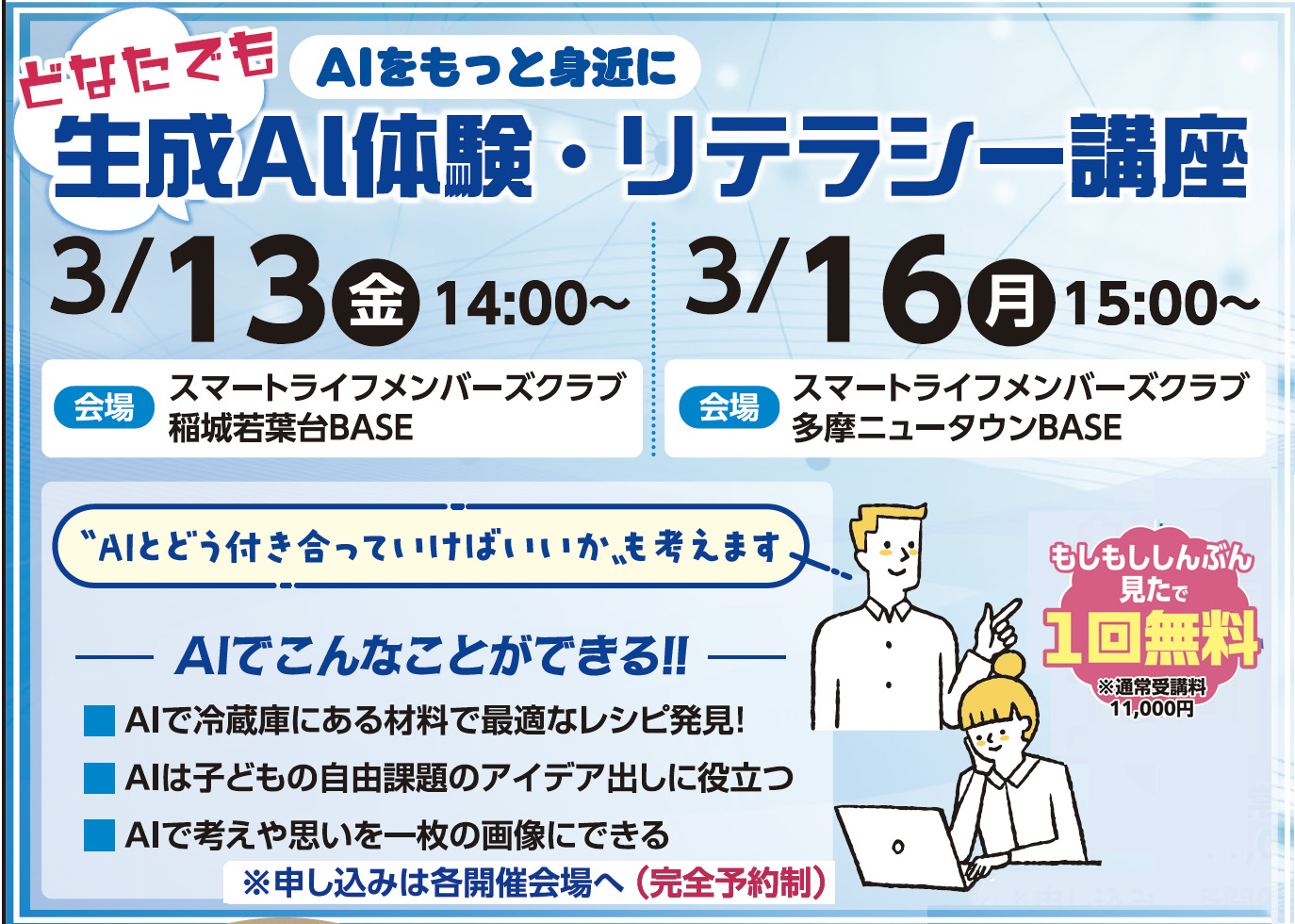 『もしもし』見たで、(『スマートライフメンバーズクラブプレミアム会員』未加入の方も)「生成AI体験・リテラシー講座」1回無料で受講いただけます。(一般通常受講料11,000円)