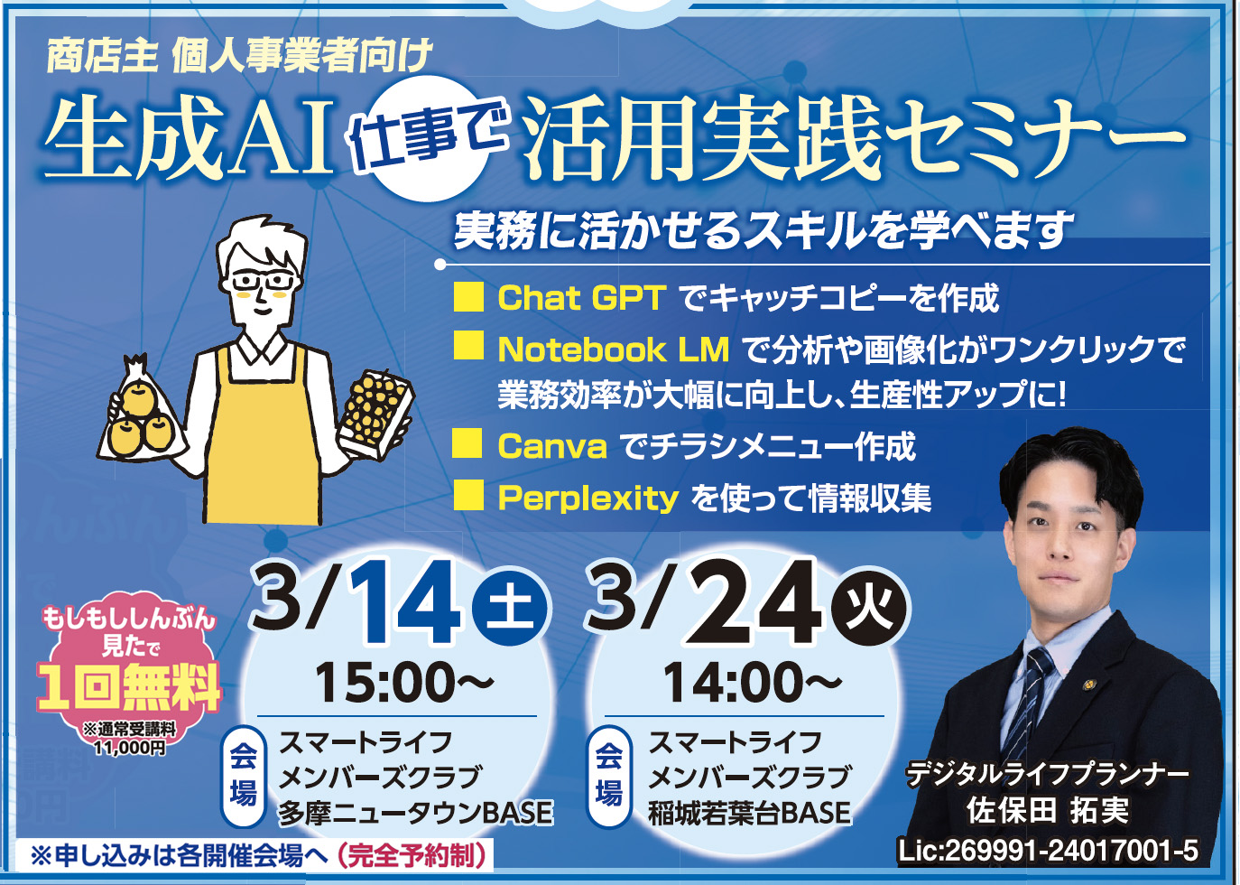 『もしもし』見たで、(『スマートライフメンバーズクラブプレミアム会員』未加入の方も)「生成AI 活用実践セミナー」1回無料で受講いただけます。(一般通常受講料11,000円)
