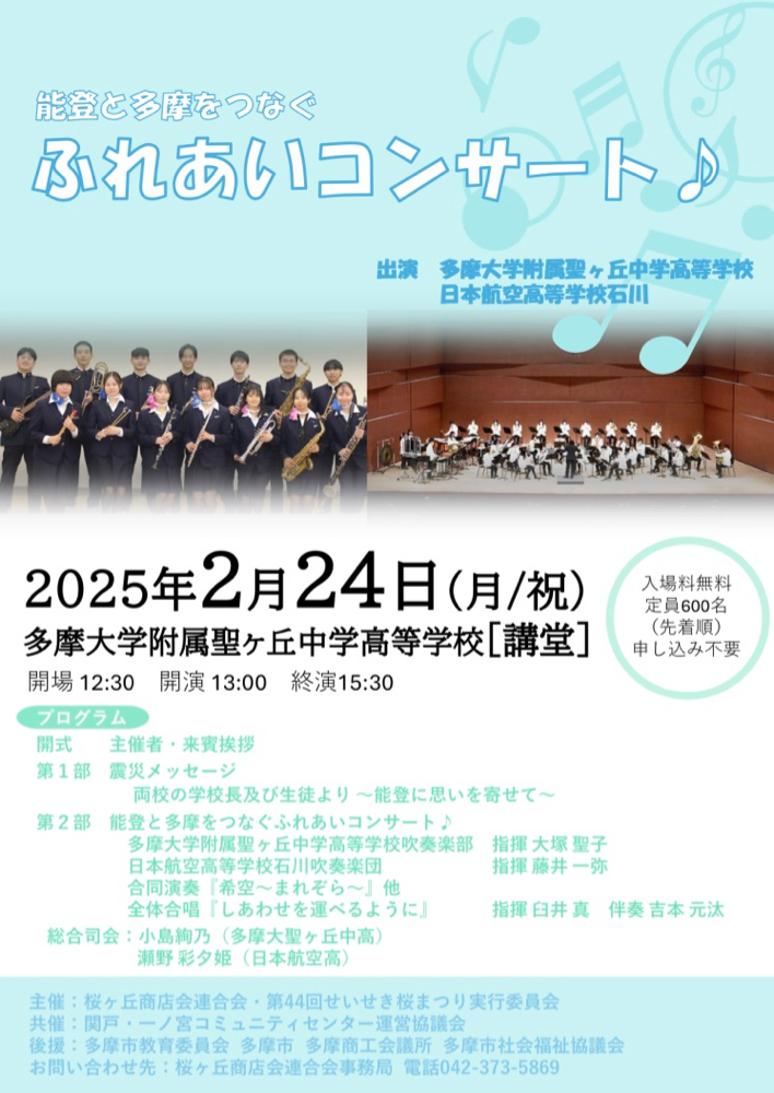 能登半島地震の復興支援を目的とした「能登と多摩をつなぐふれあいコンサート♪」。20242024年1月1日の令和6年能登半島地震で被災され、現在明星大学青梅キャンパスに避難されている日本航空高等学校石川の吹奏楽団の皆さんを多摩市に招き、多摩大学附属聖ヶ丘中学高等学校吹奏楽部と一緒に素晴らしい演奏を届けてくれます。震災メッセージとともに、ぜひお聴きください。