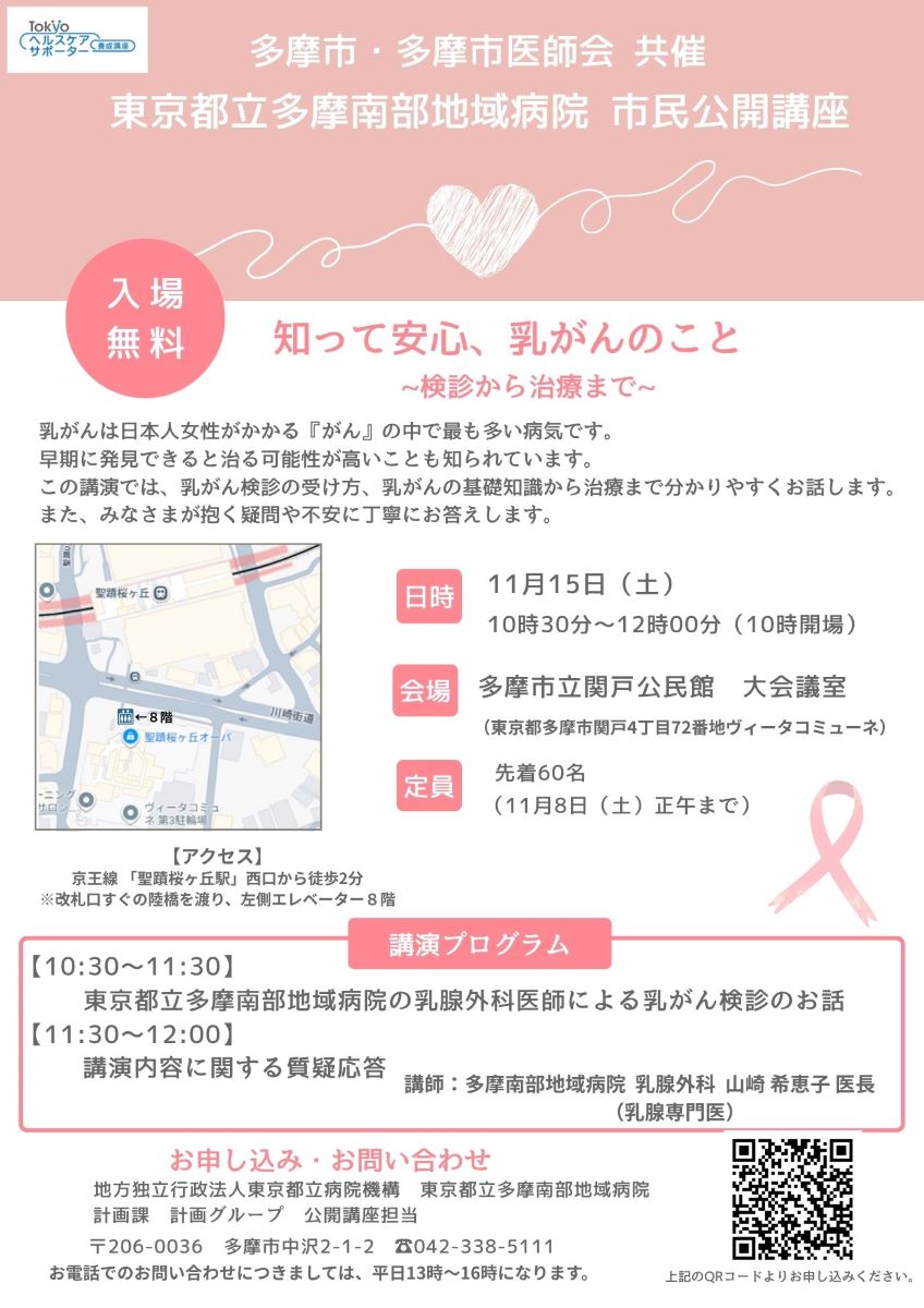 多摩市・医師会共催 市民公開講座【知って安心、乳がんのこと~検診から治療まで~】(11/8申込締切)
