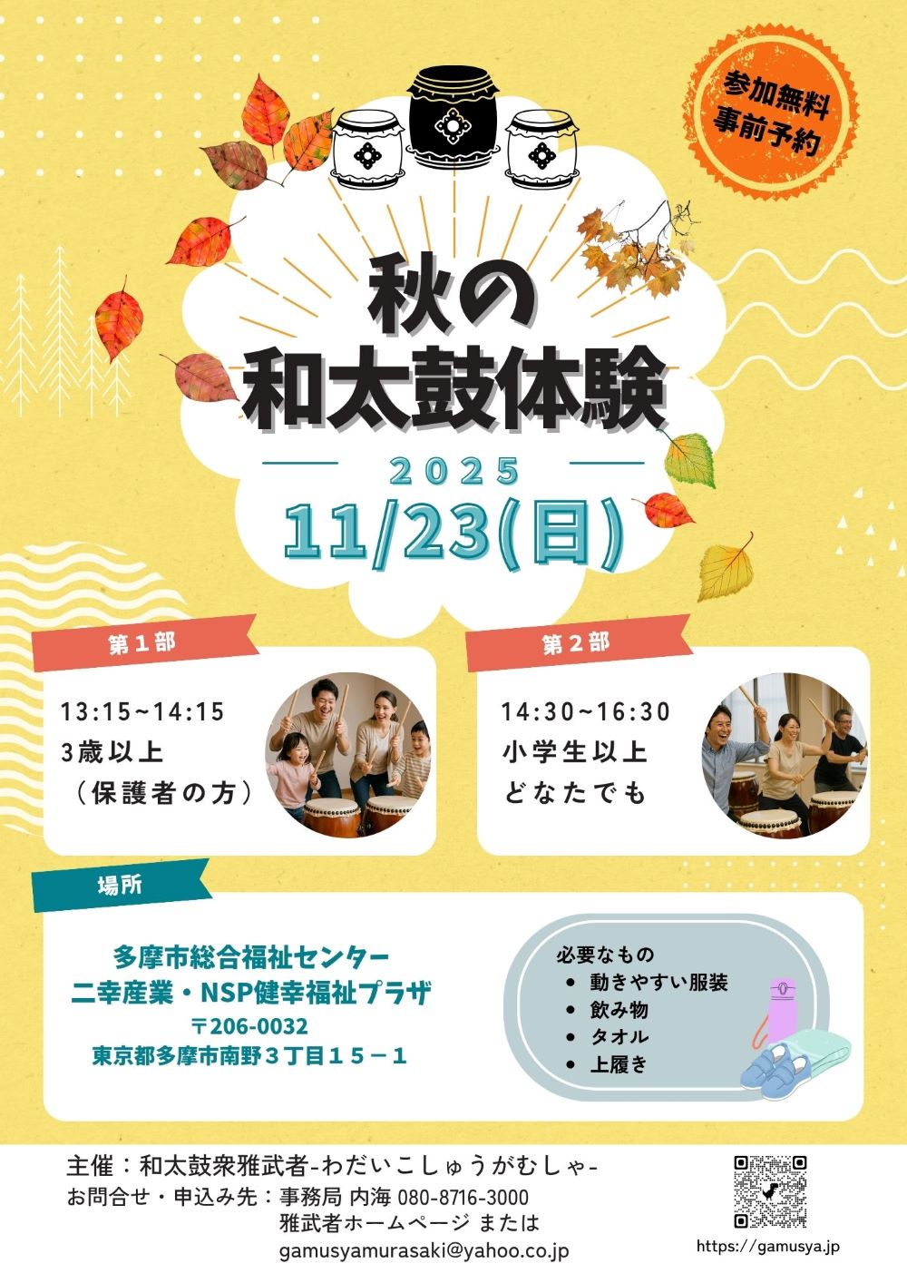楽な服装、上履き持参でご参加ください。バチは、用意します。