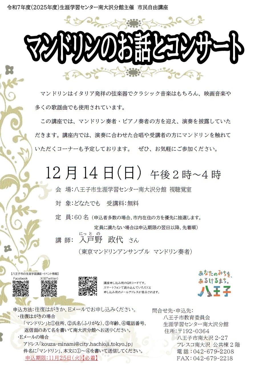 市民自由講座「マンドリンのお話とコンサート」(11/25申込〆切)