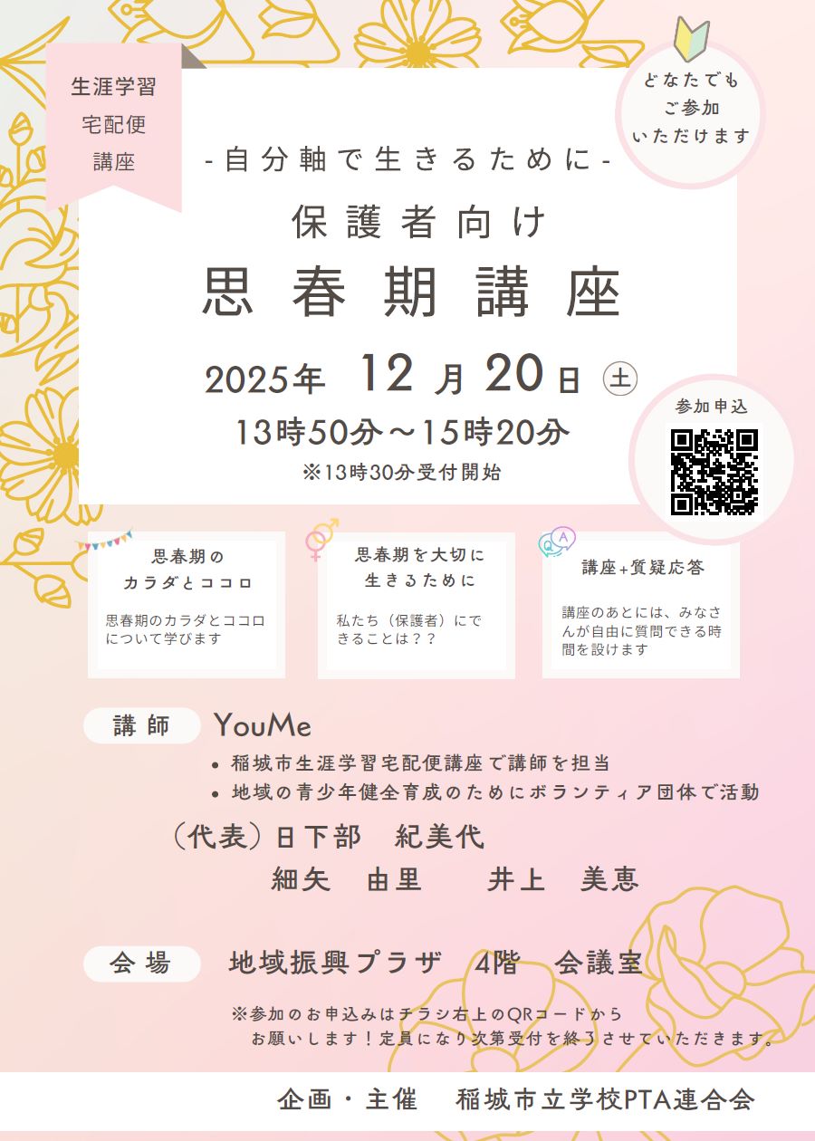 この講座では、思春期の子どもへの理解を深めながら、親としての寄り添い、関わり方などを一緒に考えていきます。