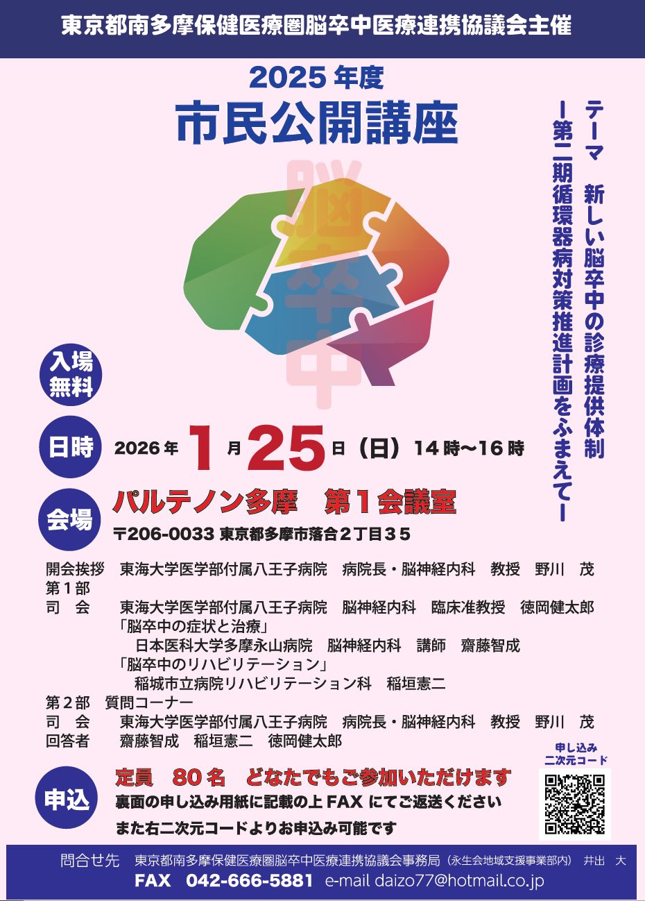 | 問い合わせ先 | 東京都南多摩保健医療圏脳卒中医療連携協議会事務局(永生会地域支援事業部内)井出大 |