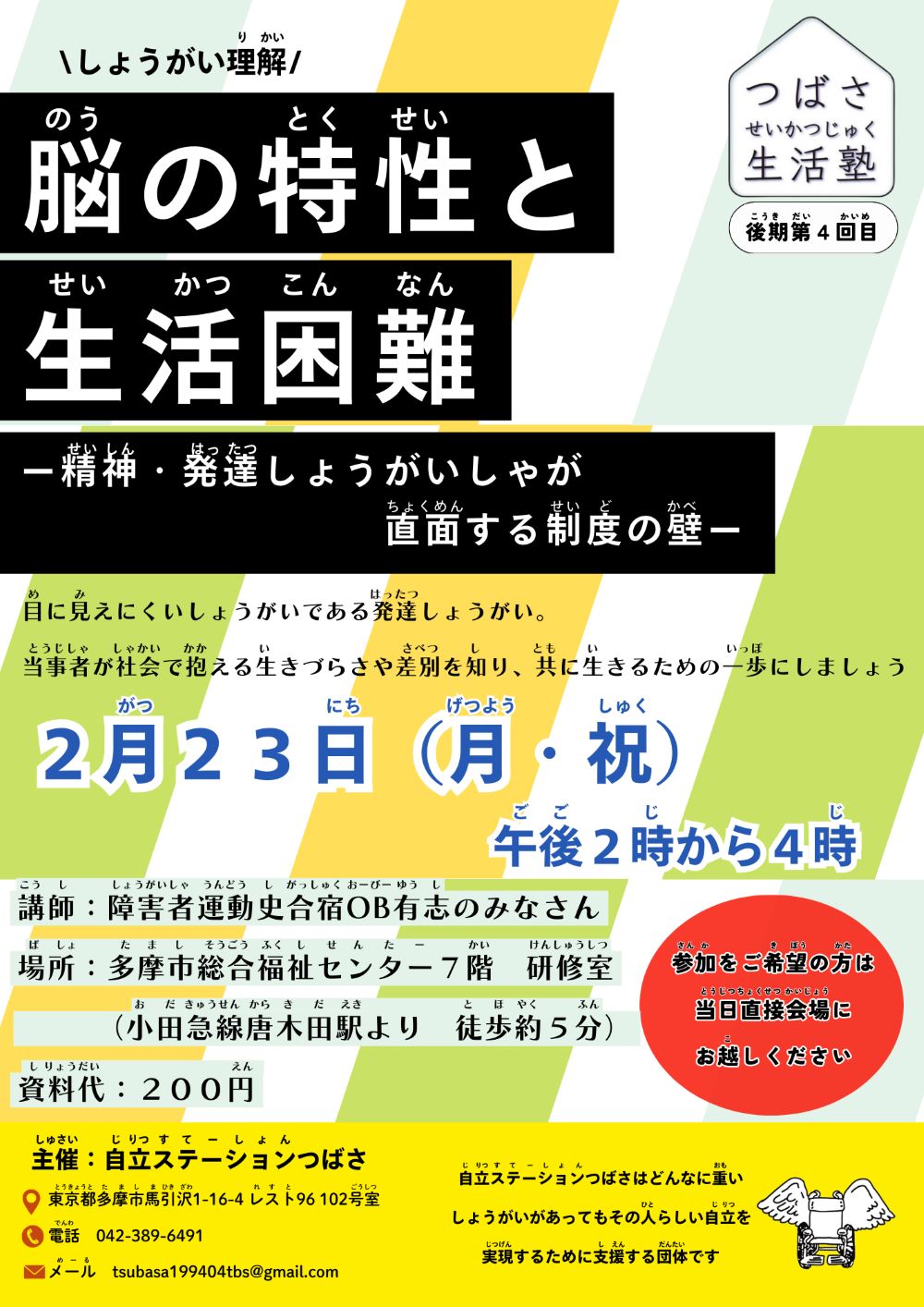 つばさ生活塾 後期第4回目 脳の特性と生活困難~精神・発達しょうがいしゃが直面する制度の壁~