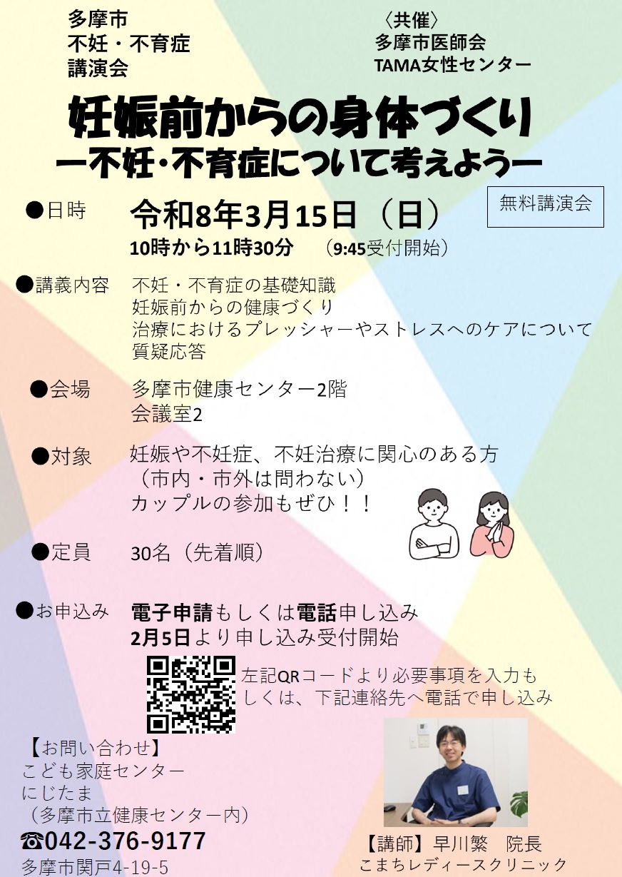 令和7年度は、多摩市内で不妊・不育症治療の最前線で活躍しておられる『こまちレディースクリニック』の早川先生を招き、不妊症・不育症の基礎知識、妊娠前からの健康づくり、治療におけるストレスやプレッシャーへのケアなどについて話をしていただきます。