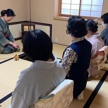 同教室では、折々に趣向を凝らした茶事を行います。亭主とお客さまとなり、懐石料理を楽しみながら、茶道の真髄を味います。今回は、茶名を拝受した生徒さんのお祝いの茶事を開催。茶道における新たな門出を祝い、心温まるひとときを共に過ごしました。