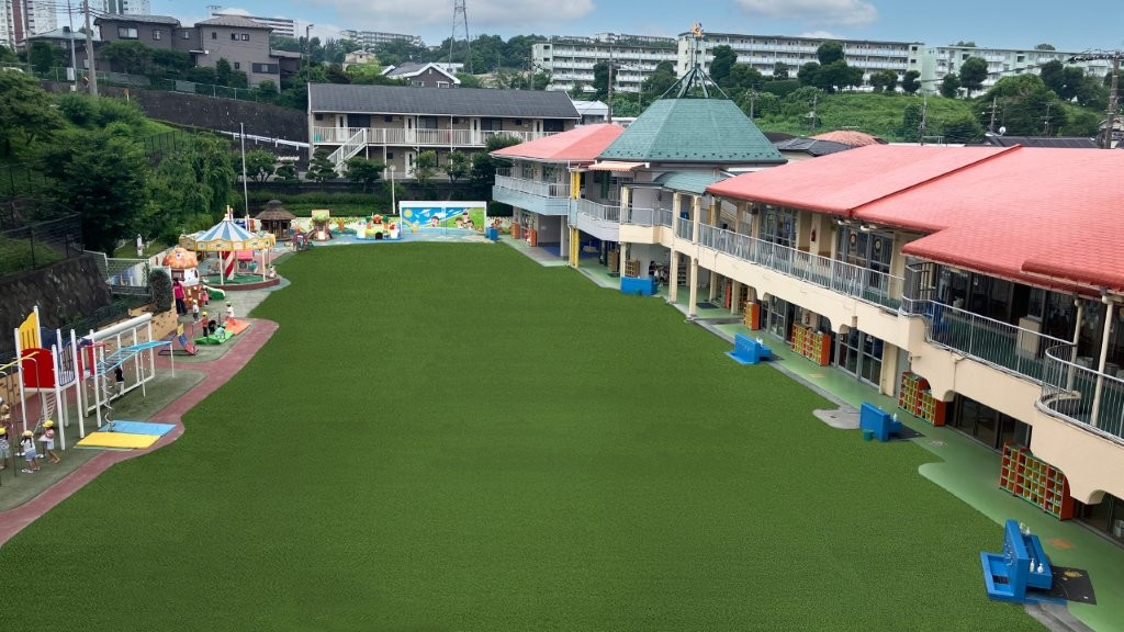 広い園庭が、オールシーズン「緑」のふわふわ人工芝に!