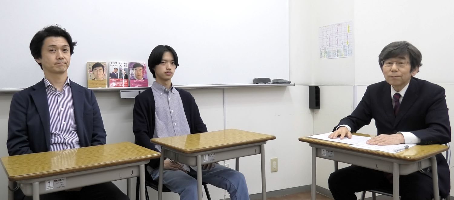 小村:今日は、郡悠斗(こおりはると)くん、この春、東京薬科大学生命科学部生命医科学科に合格進学する生徒さん、そしてそのお父様にお越しいただきました。今日はどうもありがとうございます。郡くんは由木中学校、私立の工学院大学附属高等学校を経て東京薬科大学に合格進学される生徒さんです。彼は、学校推薦型選抜一般公募入試を経て合格された生徒さんです。今は入試の種類がいっぱいありまして、本校の推薦入試を一手に引き受けて立派な成績を出している倉田にはかなわないのですが、私の理解によれば、指定校推薦とはちがって、また一般入試とも違う。試験の時期は秋だと思います。そして筆記試験があります。郡君の場合は生物と英語。志望理由書を書いて、さらに面接もあるんですね。そのような、指定校推薦と一般入試のやや一般入試よりという入試形態で入試を突破された生徒さんです。東北大学では、この入試で合格した生徒さんが入学後も一番伸びるという話を私は聞きました。以上の前提で合格体験記に従って、話を伺います。